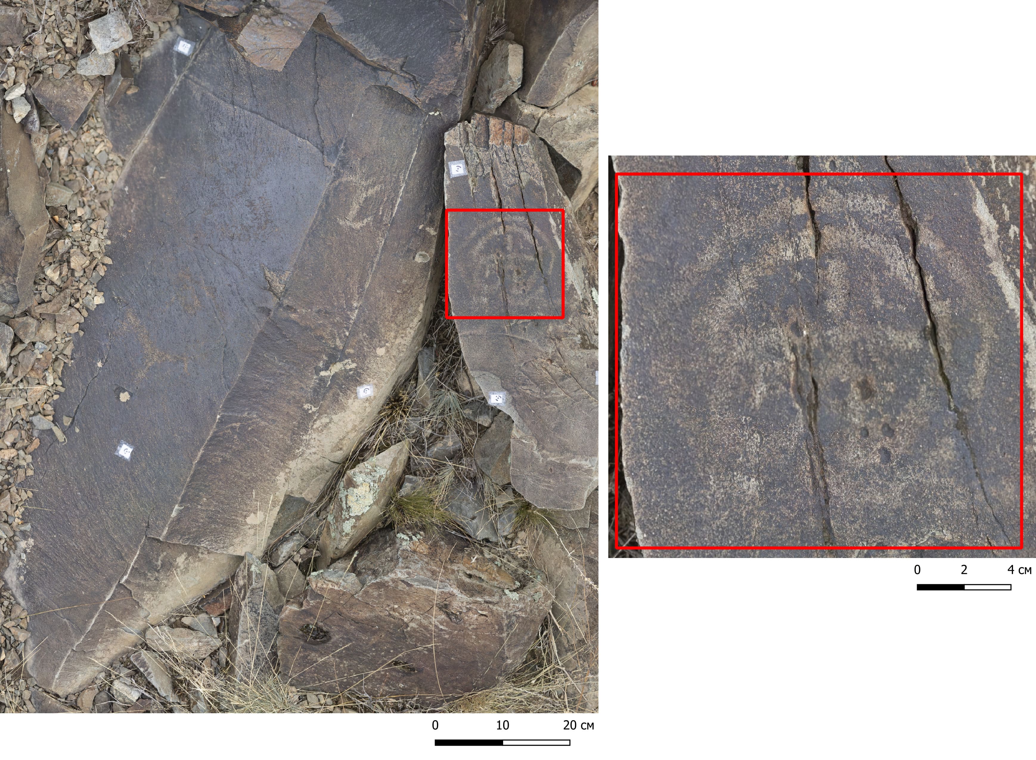 Общее количество камней с петроглифами составляет около 400, однако их распределение по условно выделенным группам неравномерно, что связано с воздействием природных факторов. Наибольшая концентрация рисунков наблюдается во второй и третьей группах. Петроглифы в основном высечены на вертикальных и наклонных поверхностях, реже — на горизонтальных. Плоскости с изображениями преимущественно ориентированы на юг, реже — на восток и юго-запад, и лишь изредка — на север.