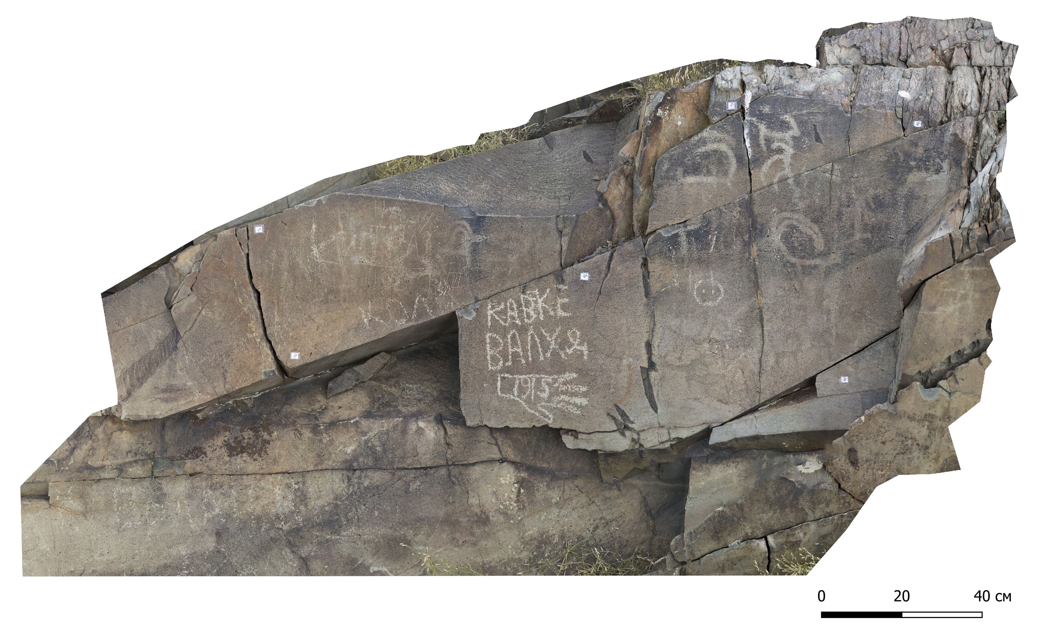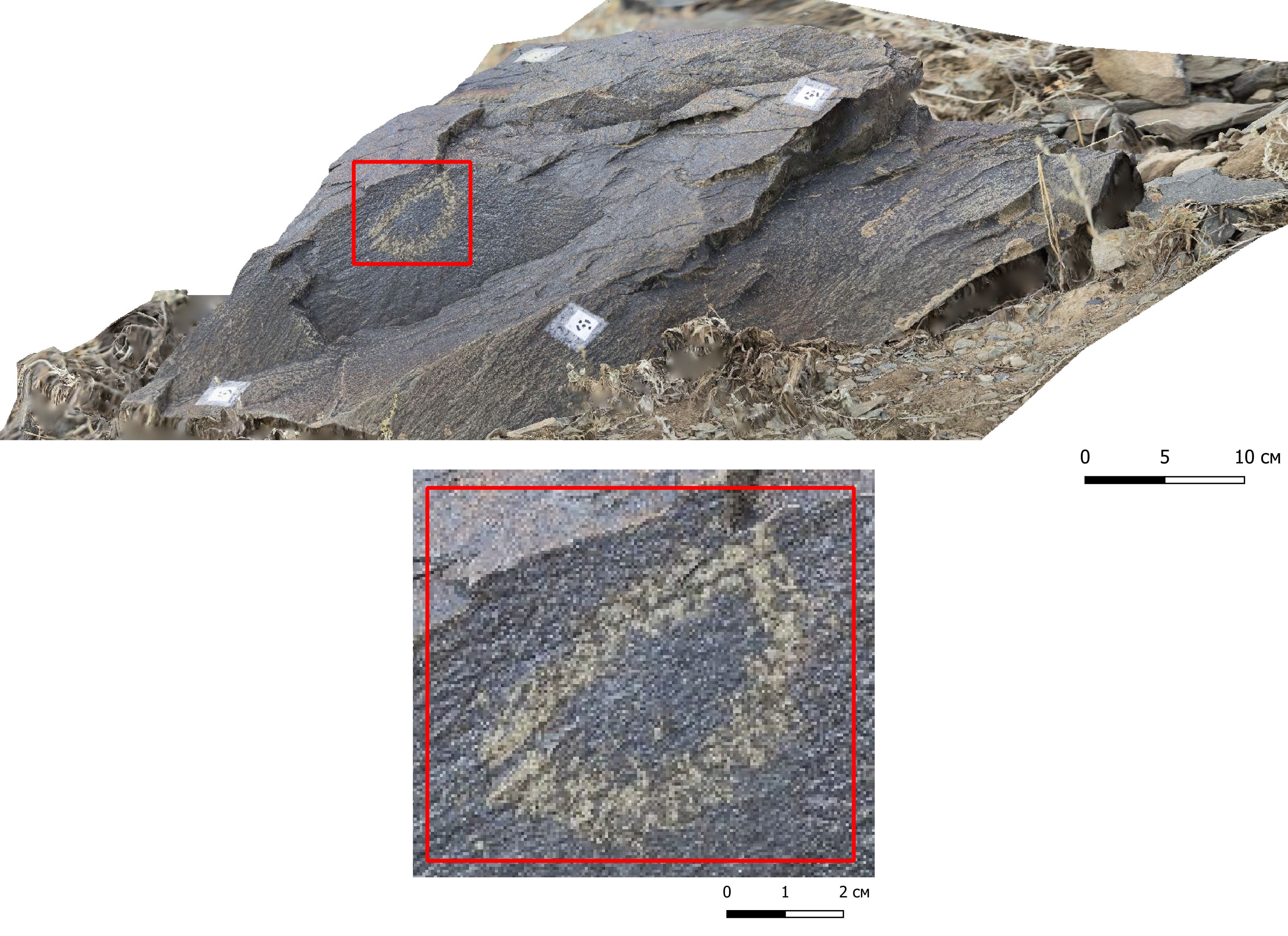 На памятнике Мойнак выявлено 5 поверхностей, где встречены знаки и символы. Поверхность 1 (координаты WGS1984: 48°36'47.64"N 83°51'53.10"E) имеет горизонтальную экспозицию. На поверхности 1 имеется один знак (Рисунок 2). Поверхность 2 (координаты WGS1984: 48°36'46.79"N 83°51'54.60"E) имеет горизонтальную экспозицию. На поверхности 2 имеется один знак (Рисунок А.46). Поверхность 3 (координаты WGS1984: 48°36'46.20"N 83°51'56.64"E) имеет вертикальную экспозицию. На поверхности 3 имеется один знак (Рисунок А.47). Поверхность 4 (координаты WGS1984: 48°36'44.78"N 83°51'56.69"E) имеет горизонтальную экспозицию. На поверхности 4 имеется одно изображение (Рисунок А.48). Поверхность 5 (координаты WGS1984: 48°36'40.81"N 83°51'56.46"E) имеет вертикальную экспозицию. На поверхности 5 имеется множество изображений (Рисунок А.49).