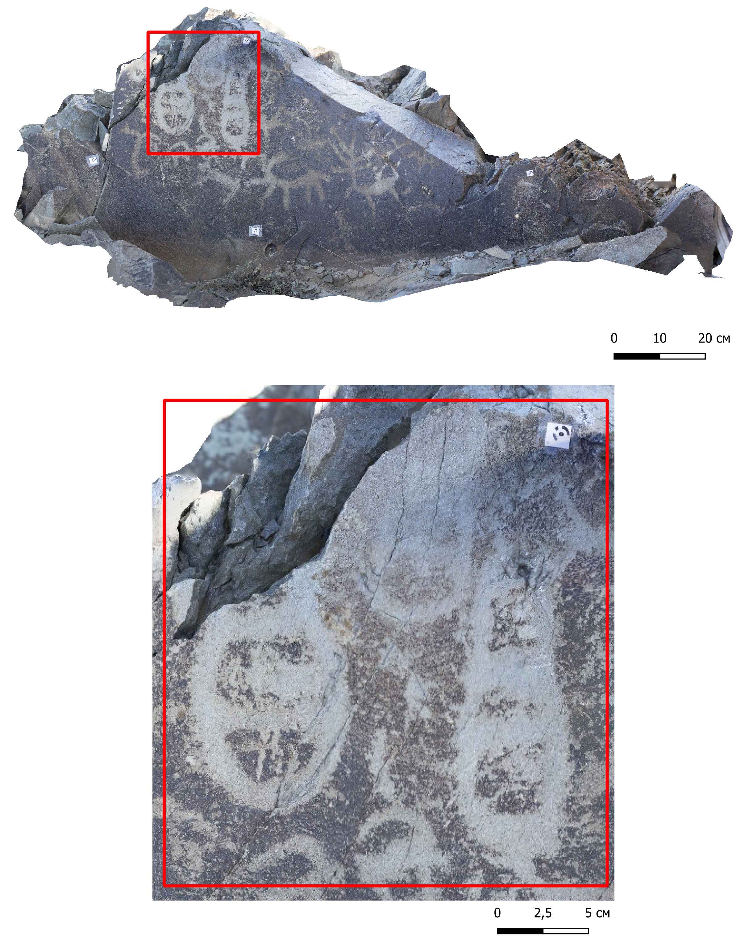 Түлкіне ескерткішінде белгілер мен символдар бедерленген 6 бет анықталып отыр. Бірінші бет (WGS1984 координаттары: 48°35'31.20"N 83°51'59.39"E) көкжиектен 45 градус экспозицияда тұр. Бетінде бір белгі бар (Сурет 2). Екінші бет (WGS1984 координаттары: 48°35'30.20"N 83°52'0.72"E) көкжиектен 45 градус экспозицияға ие. Бетінде үш белгі бар (Сурет 3). Үшінші бет (WGS1984 координаттары: 48°35'30.69"N 83°52'1.16"E) көлденең жатыр. Бетінде бір белгі бар (Сурет 4). Төртінші бет те (WGS1984 координаттары: 48°35'30.62"N 83°52'1.84"E) көлденең жатыр. Бетінде бірнеше белгілер бар (Сурет 5). Бетінің бір бөлігіне қазіргі заманғы бүлдіргіштер әдепсіз суреттер салып бүлдірген. Бесінші бет (WGS1984 координаттары: 48°35'30,33"N 83°52'1,56"E) тігінен тұр. Бетінде бір белгі бар (Сурет 6). Алтыншы бет те (WGS1984 координаттары: 48°35'29.72"N 83°52'0.54"E) тігінен тұр. Бетінде көптеген бейнелер бар (Сурет 7).