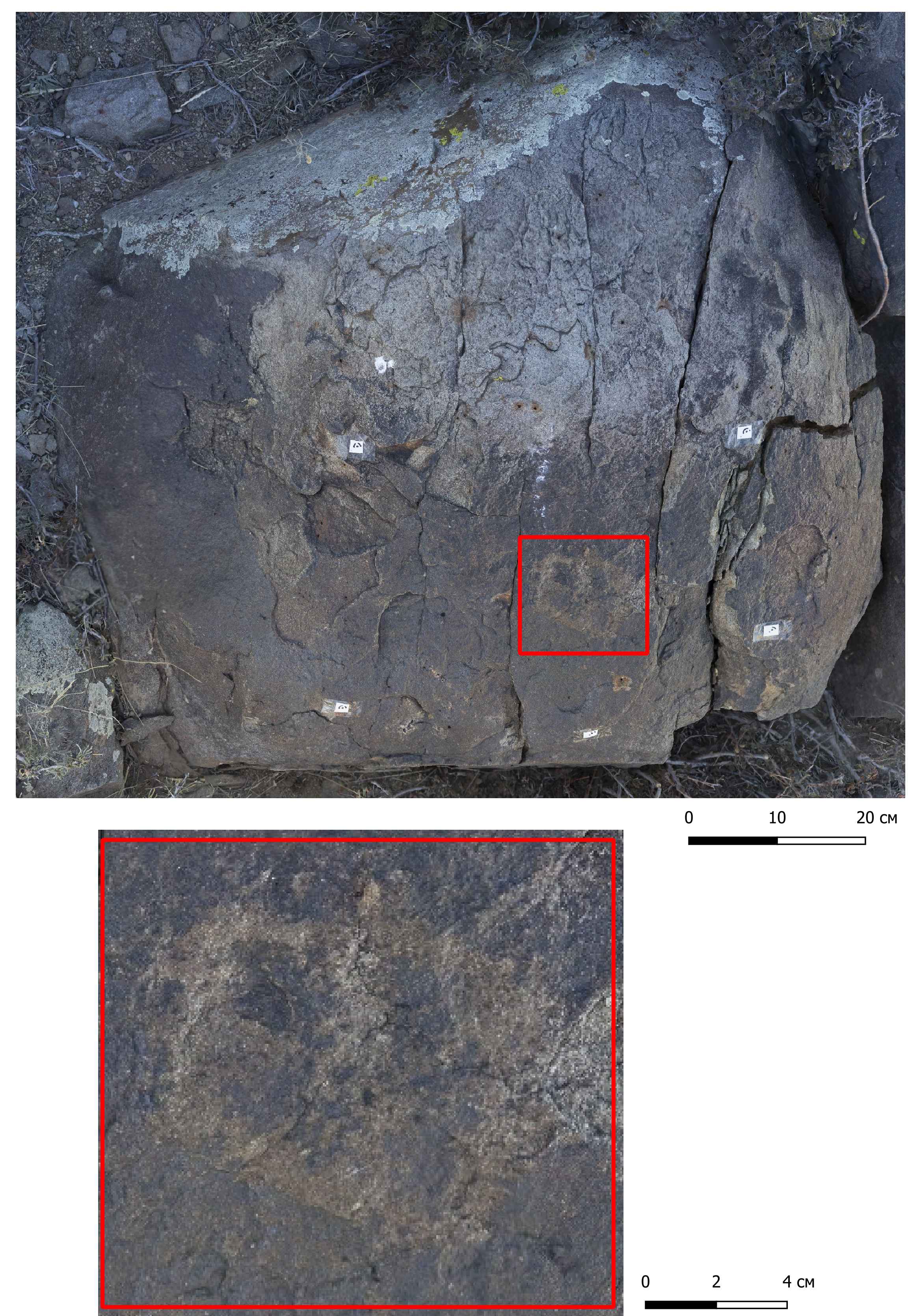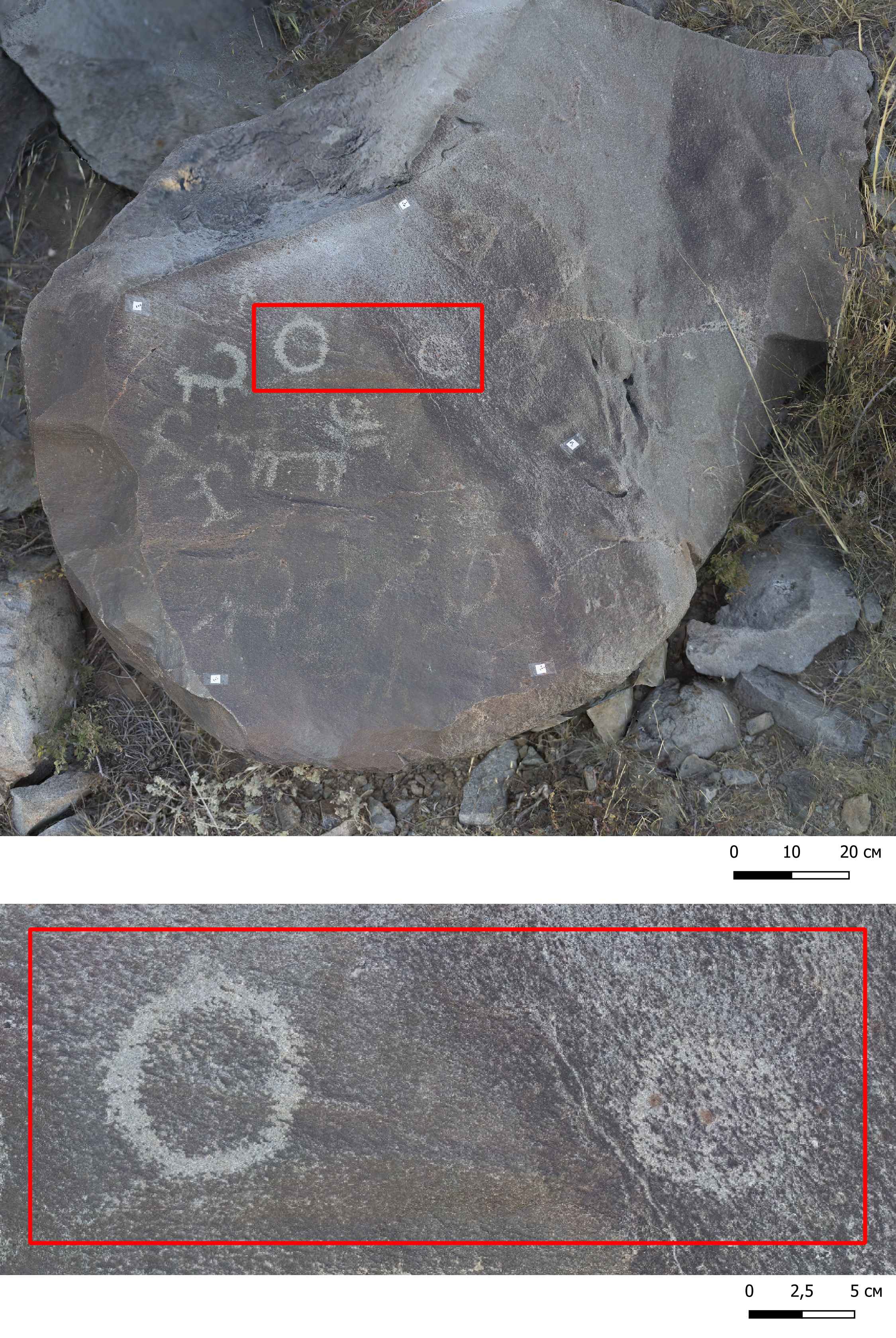 Бұл ескерткіштегі бейнелер қойтастарға және қара-сұр негізгі тау жыныстарының жақпарларына қашалған. Екі кезеңнің – қола дәуірі мен ерте темір дәуірінің петроглифтері айқын көрінеді. Ерте темір дәуіріне бұғы мен тау ешкілерінің бейнелері кіреді, олардың кейбіреулері скиф-сібір аң стилінде жасалған.