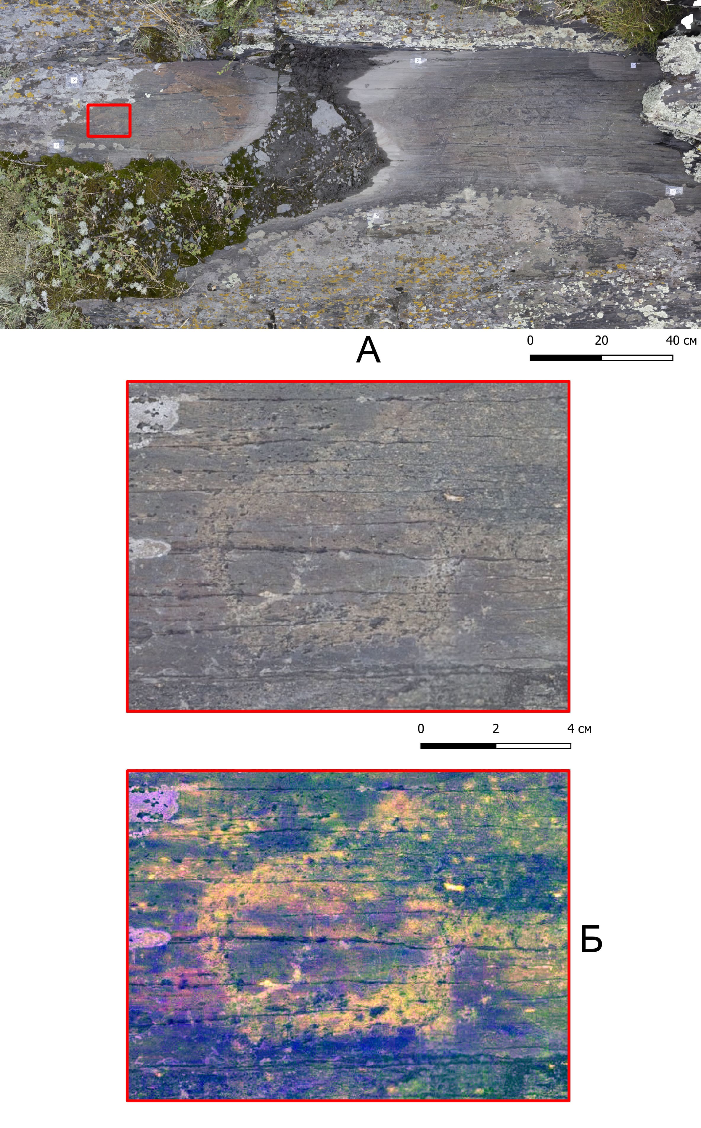 Қарымсақ ескерткішінде белгілер мен белгілер табылған екі бет (тас беті) анықталды. Бірінші бет (WGS1984 координаттары: 49°40'30,88"N 82°37'15,00"E) тік экспозицияда тұр. Екі элемент бедерленген – белгі және адамның бейнесі (Сурет 2). Екінші бет те (WGS1984 координаттары: 49°40'34.01"N 82°37'1.19"E) тік экспозицияда. Оның бетінде бейнелер көп, белгілер саны – 3 белгі (Сурет 3).
