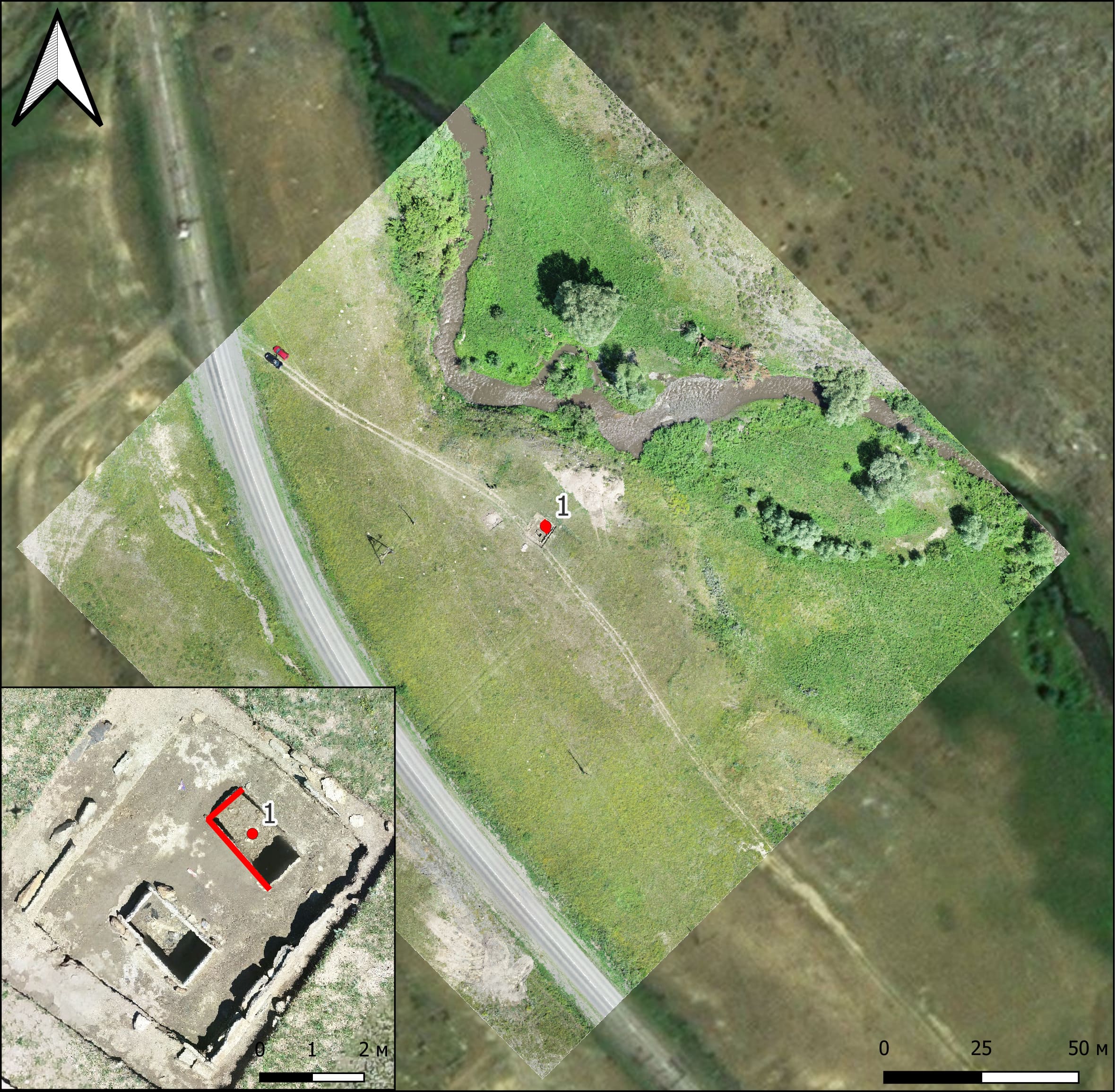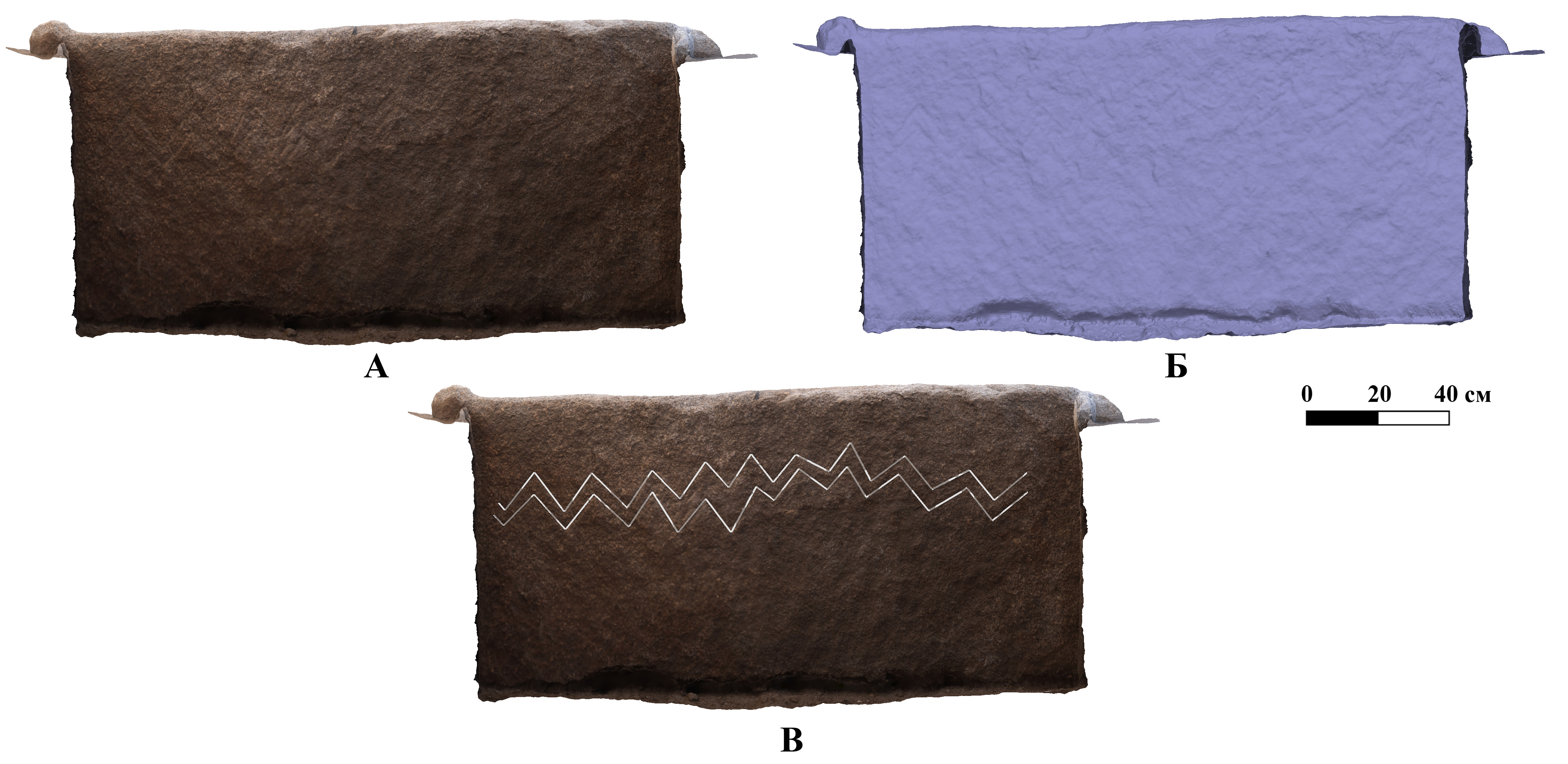 №1 тас жәшіктің екі тақтасында ирек сызықтар анықталды (WGS1984 координаттары: 49°39'40.46"N 82°39'37.52"E) (Сурет 2). Тастақталар тігінен орналасқандықтан, сәйкесінше таңба-белгілер тік экспозицияда тұр. Оңтүстік-батыс (ОБ) тақтасында сызықтар in situ, текстурасы бар және текстурасыз 3D үлгісінде де көрінді (Сурет 3). Солтүстік-батыс (СБ) тастақтада сызықтар текстурасы жоқ беттік рельефті көрсетуде дәл 3D үлгісінде табылды (Сурет 4).