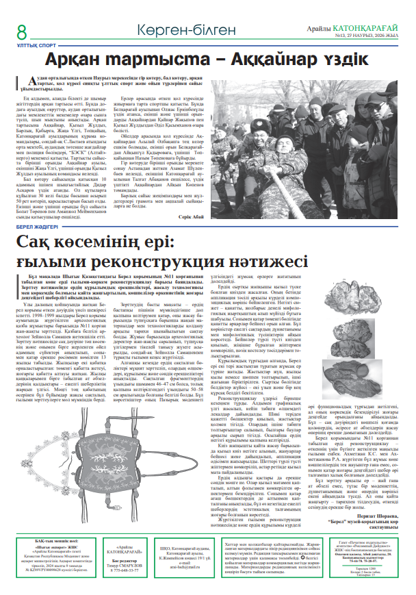 Біз БАҚ назарында! Берел мемлекеттік тарихи-мәдени қорық-музейінің Экскурсиялық қызмет көрсету бөлімінің меңгерушісі Мухтарханов Азат Мамырбекұлының «Берел қазыналары – Алтайдың мәңгі мұрасы» атты мазмұнды мақаласы «Арайлы Катонқарағай» газетінің №49 саны