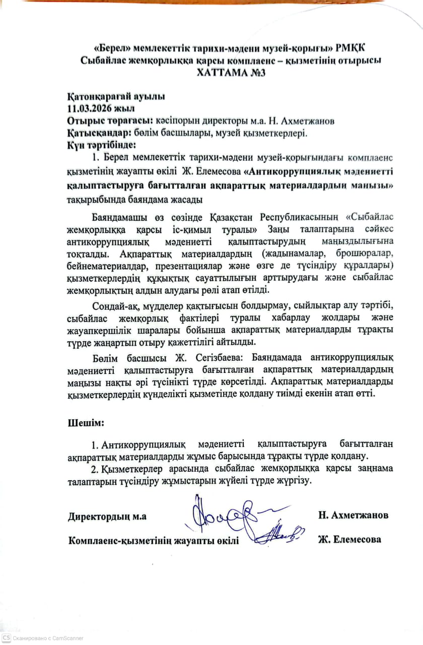 2026 жылғы 14 қаңтарда «Берел» мемлекеттік тарихи-мәдени музей-қорығында сыбайлас жемқорлыққа қарсы комплаенс қызметінің отырысы өтті.