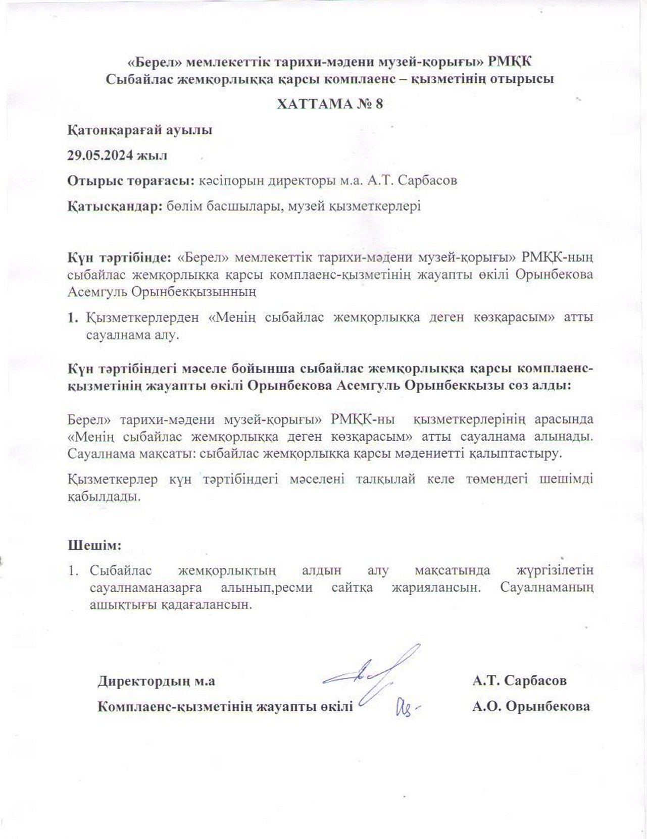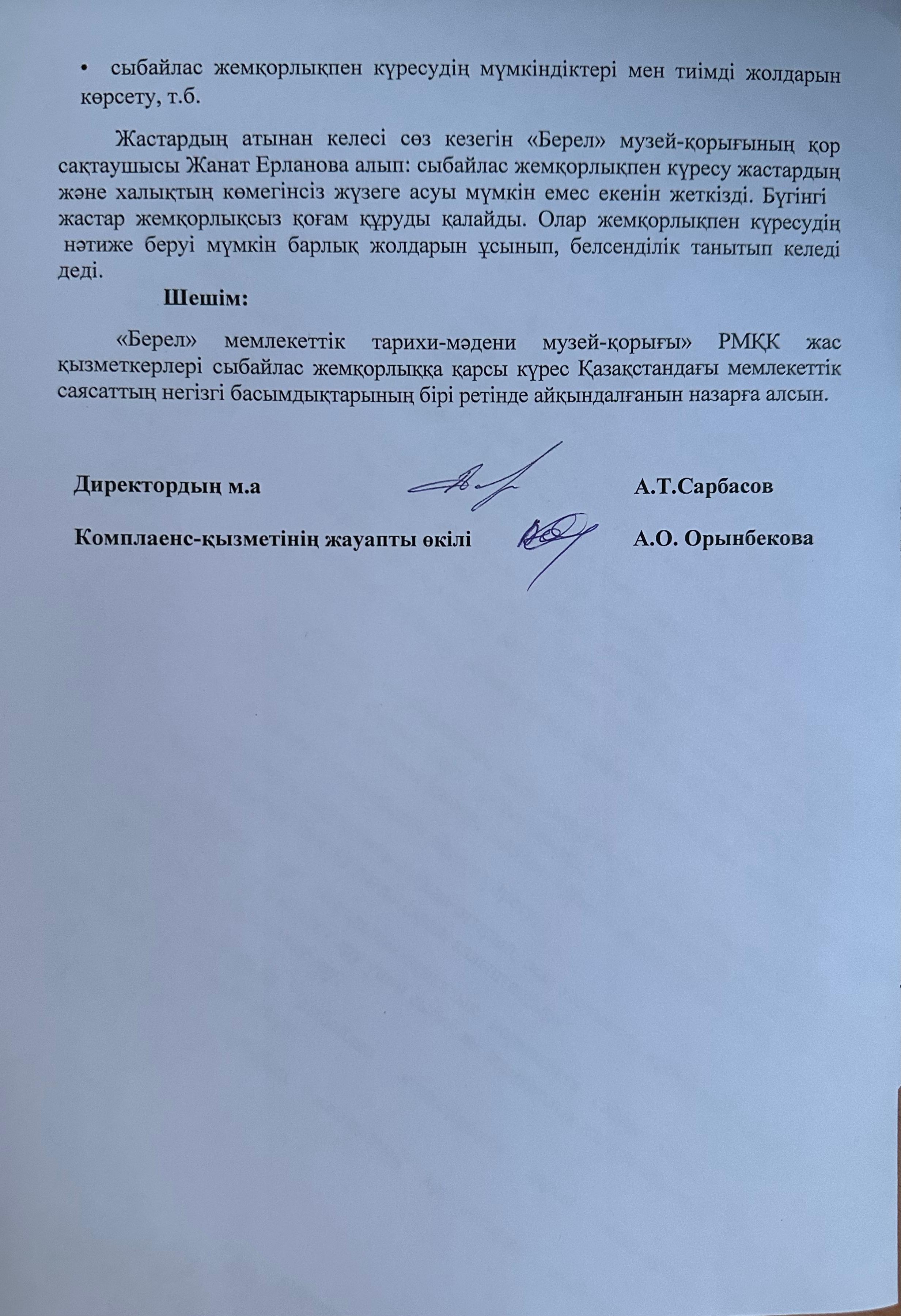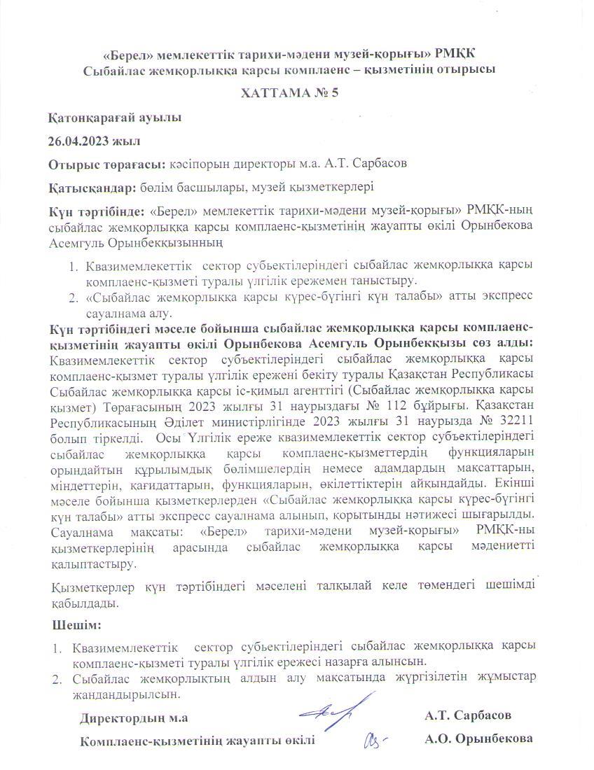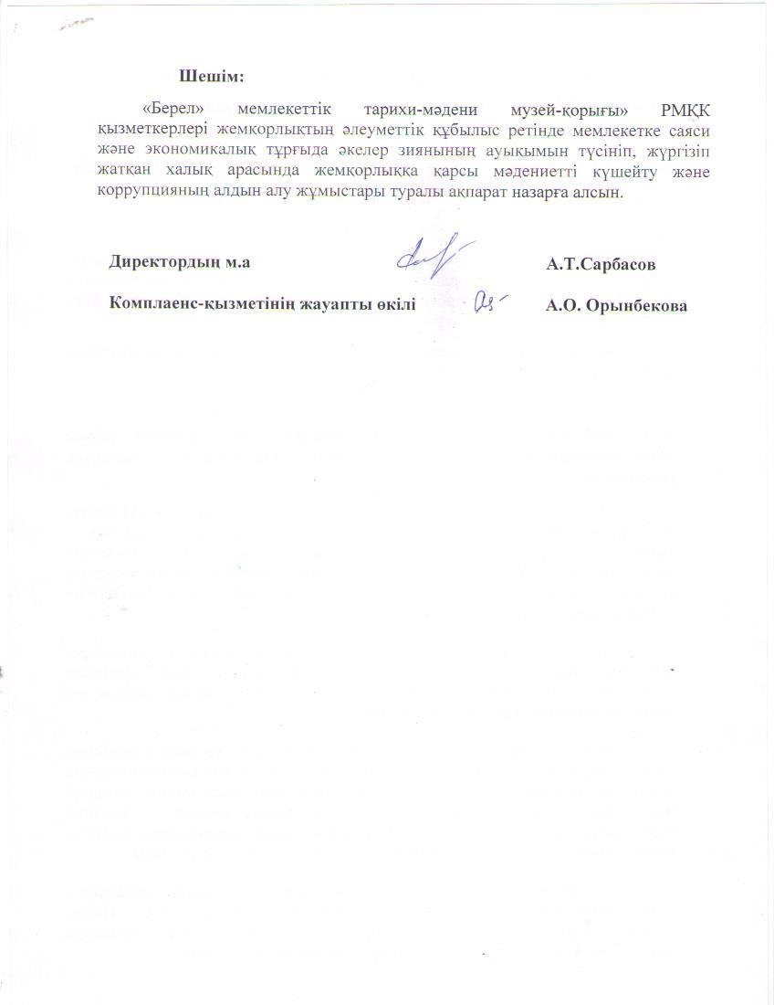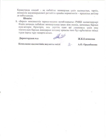 Жоғарыда айтылған бұйрықты назарға ала отырып мамыр айында біздің мекемеде де «Берел» мемлекеттік тарихи-мәдени музей-қорығы» РМҚК сыбайлас жемқорлыққа қарсы комплаенс-қызметтер туралы үлгілік ереже бекітілді. Үлгілік ереже 3 тараудан, 30 тармақтан тұрады.