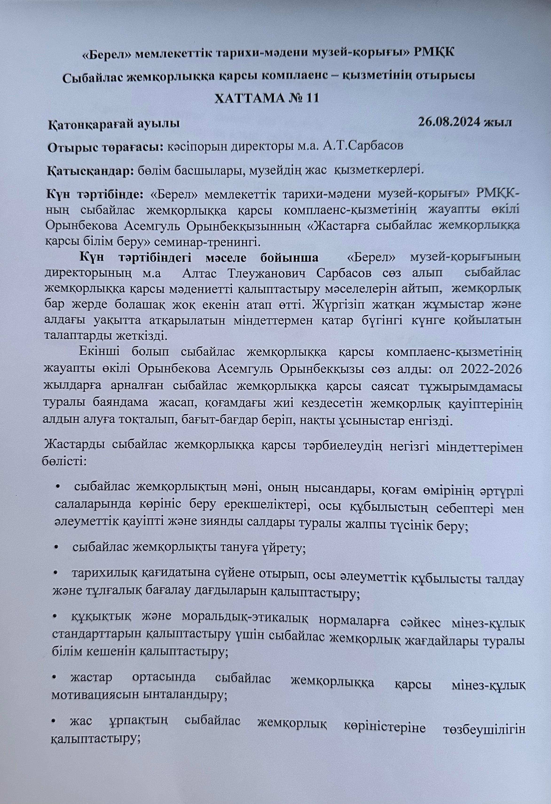 «Берел» мемлекеттік тарихи-мәдени музей-қорығы» РМҚК-ның сыбайлас жемқорлыққа қарсы комплаенс-қызметінің жауапты өкілі Орынбекова Асемгуль Орынбекқызынның «Сыбайлас жемқорлықсыз болашақ» тақырыбында семинар-сабақ өткізді.