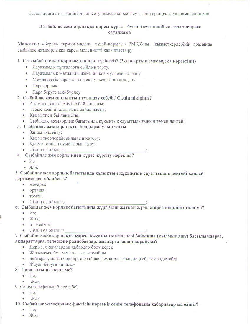 "Берел" мемлекеттік тарихи-мәдени музей-қорығы РМҚК қызметкерлерінен «Сыбайлас жемқорлыққа қарсы күрес – бүгінгі күннің талабы» тақырыбында сауалнама алынды.