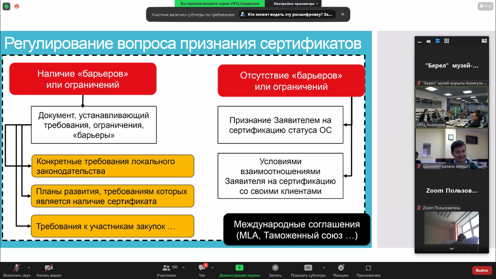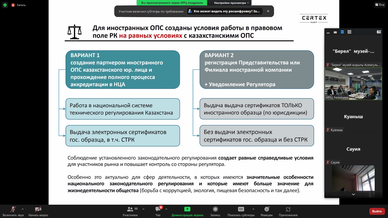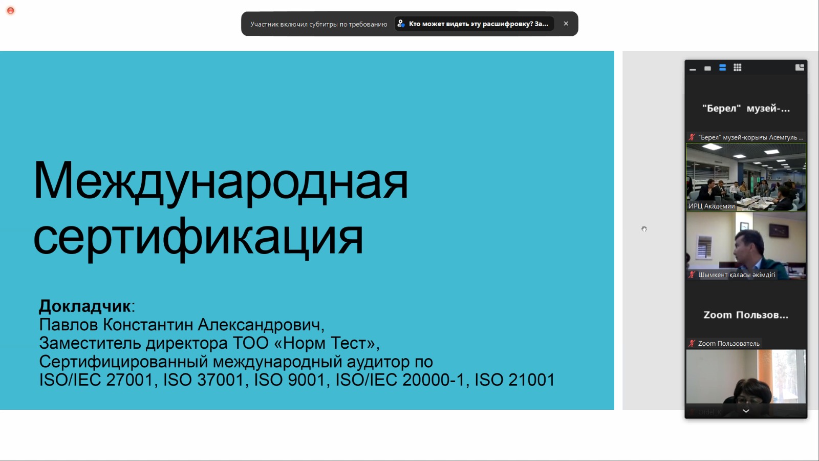 Кездесудің мақсаты – Қазақстан Республикасындағы ISO 37001 стандарты бойынша халықаралық сертификаттаудан өту, қалыптасқан тәжірибе және оны құқықтық реттеу мәселелерін талқылау.