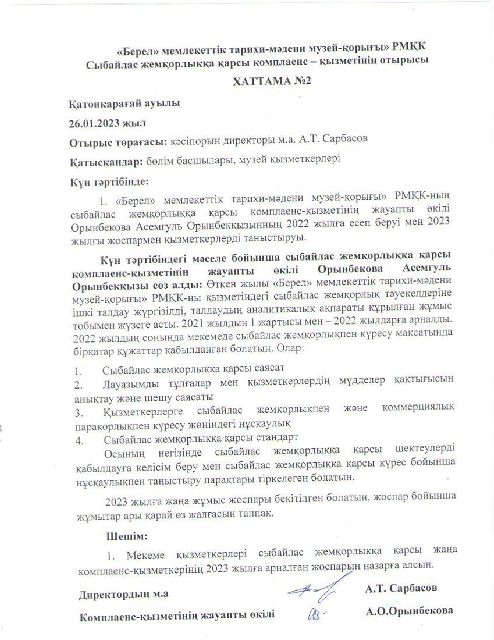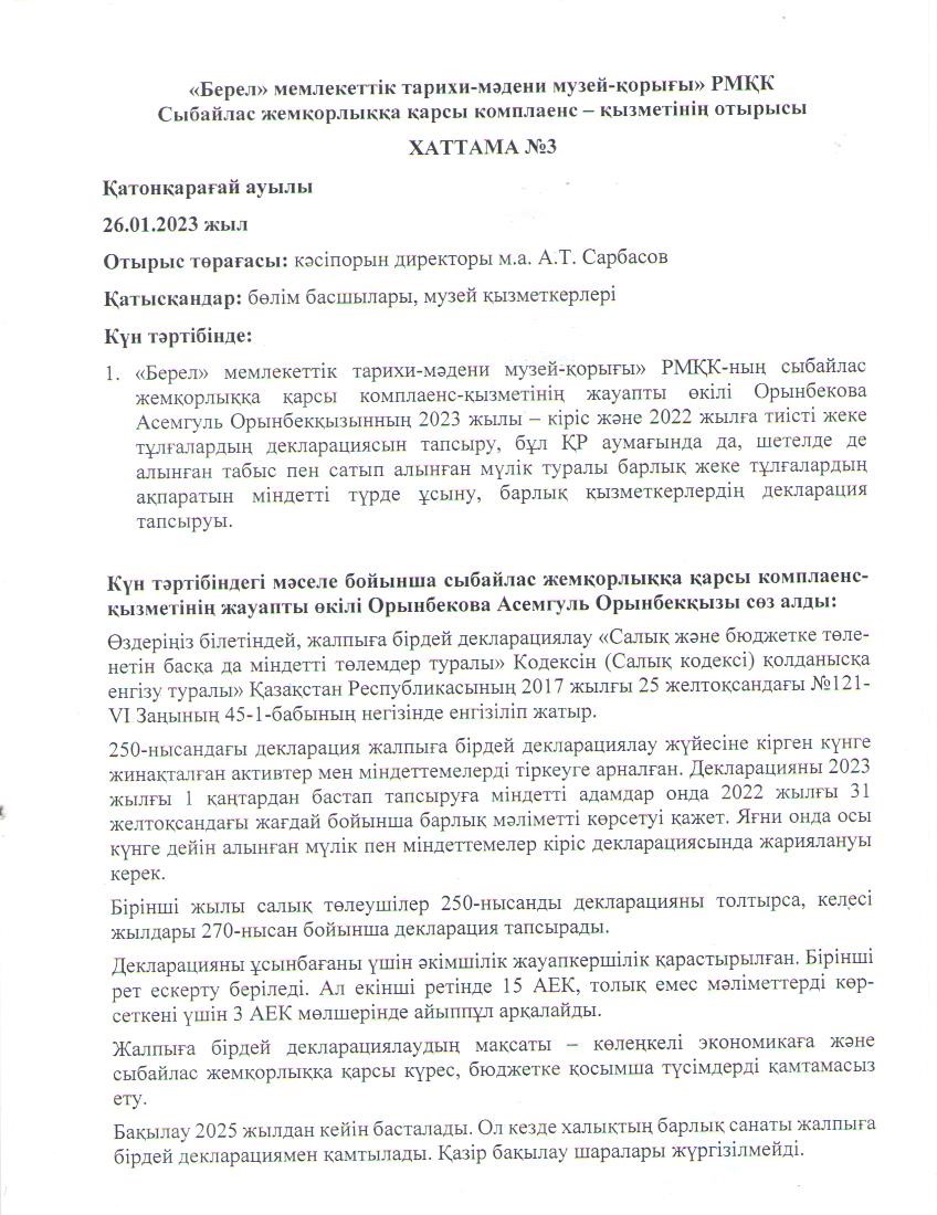 «Берел» мемлекеттік тарихи-мәдени музей-қорығы» РМҚК Сыбайлас жемқорлыққа қарсы комплаенс – қызметінің отырысы 2023 жылдың 26 қаңтарында өткізілді.