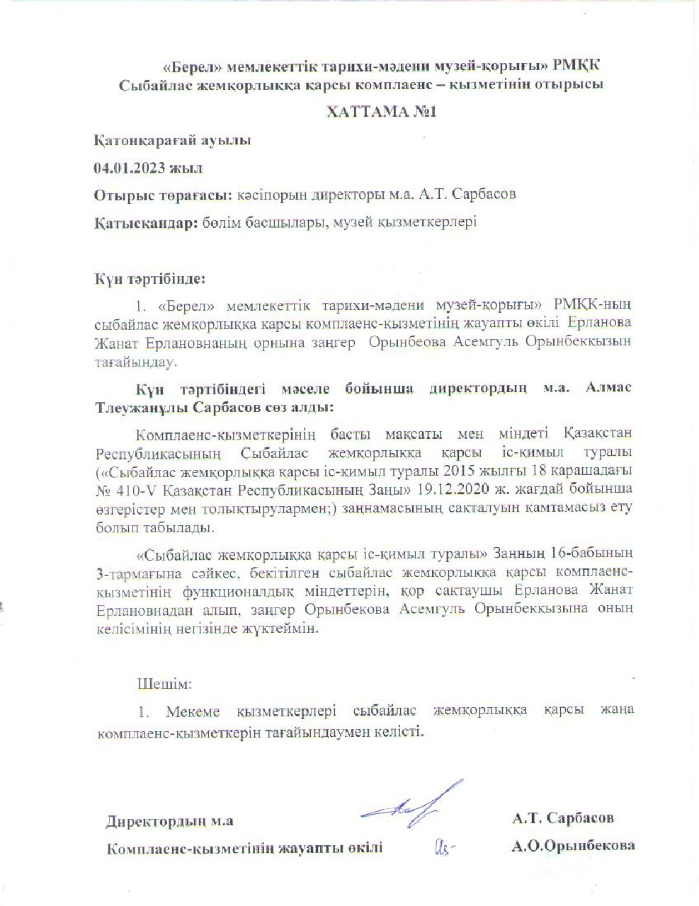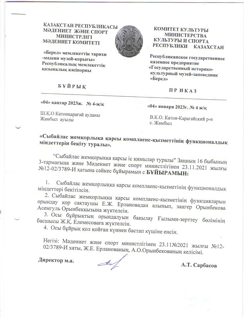 «Сыбайлас жемқорлыққа қарсы іс-қимыл туралы» Заңның 16-бабының 3-тармағына сәйкес, «Берел» мемлекеттік тарихи-мәдени қорық-музейі» РМҚК сыбайлас жемқорлыққа қарсы комплаенс-қызметінің міндетін орындауды заңгер Орынбекова Асемгуль Орынбекқызына оның келісімінің негізінде, «Берел» мемлекеттік тарихи-мәдени қорық-музейі» РМҚК директорының м.а. А.Сарбасовтың 2023 жылдың 4 қаңтарында № 4-ж/қ бұйрығымен тапсырылды.