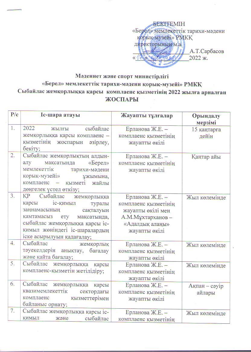 «Сыбайлас жемқорлыққа қарсы іс-қимыл туралы» Заңның 16-бабының 3-тармағына сәйкес, «Берел» мемлекеттік тарихи-мәдени қорық-музейі» РМҚК сыбайлас жемқорлыққа қарсы комплаенс-қызметінің міндетін орындауды Ерланова Жанат Ерлановнаға оның келісімінің негізінде, «Берел» мемлекеттік тарихи-мәдени қорық-музейі» РМҚК директорының м.а. А.Сарбасовтың 2021 жылдың 24 қарашасындағы № № 28-ж/қ бұйрығымен тапсырылған болатын. Комплаенс-қызметкерінің басты мақсаты мен міндеті Қазақстан Республикасының Сыбайлас жемқорлыққа қарсы іс-қимыл туралы («Сыбайлас жемқорлыққа қарсы іс-қимыл туралы 2015 жылғы 18 қарашадағы № 410-V Қазақстан Республикасының Заңы» 19.12.2020 ж. жағдай бойынша өзгерістер мен толықтырулармен;) заңнамасының сақталуын қамтамасыз ету болып табылады.