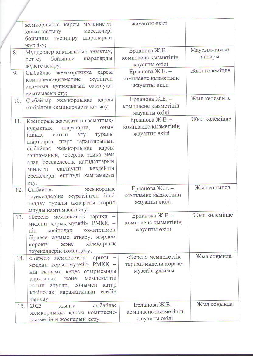 | 1 | Сыбайлас жемқорлыққа қарсы комплаенс қызметінің 2023 жылға арналған ЖОСПАРЫ |