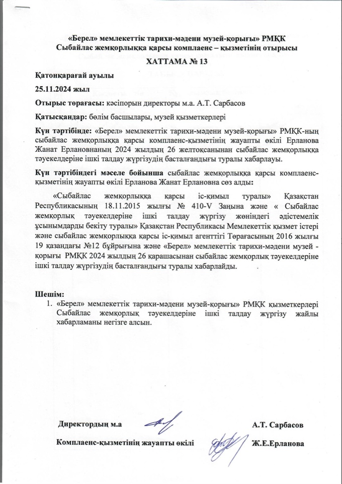 «Берел» мемлекеттік тарихи-мәдени музей - қорығында 2024 жылдың 26 қарашасынан сыбайлас жемқорлық тәуекелдеріне ішкі талдау жүргізудің басталып, мекеме басшысының бұйрығына сәйкес жұмыс тобы құрылды.
