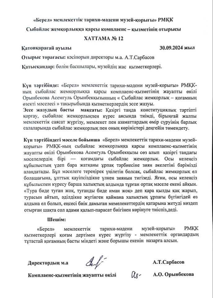 2024 жылдың 30-шы қыркүйегінде «Берел» мемлекеттік тарихи-мәдени музей-қорығы» РМҚК-ның сыбайлас жемқорлыққа қарсы комплаенс-қызметінің жауапты өкілі Орынбекова Асемгуль Орынбекқызының музей-қорық қызметкерлері арасында «Сыбайлас жемқорлық – қоғамның өзекті мәселесі» тақырыбында эссе жазуды ұйымдастырды. Эссе жазудың басты мақсаты: Қазіргі таңда конституциялық тәртіпті қорғау, сыбайлас жемқорлықпен күрес аясында тиімді, бірыңғай жалпы мемлекеттік саясат жүргізу, мемлекет пен азаматтардың өмір сүруінің барлық салаларында сыбайлас жемқорлық пен оның көріністері деңгейін төмендету. Өйткені қоғам дертімен күрес жүргізу - мемлекеттік органдардың, тұтастай қоғамның басты міндеті және борышы. Қазіргі таңдағы мәселелердің бірі — қоғамдағы сыбайлас жемқорлық. Осы келеңсіз құбылыстың үдеп бара жатқаны ұрпақ тәрбиесіне зиян әкелетіні бәрімізді алаңдатады. Бұл мәселеге тереңірек үңілетін болсақ, сыбайлас жемқорлық ел болашағына, ұлттық қауіпсіздікке үлкен зиянын тигізеді. Яғни, осы келеңсіз құбылыспен күресу барша халықтың алдында тұрған ортақ мәселе екені айқын.«Тура биде туған жоқ, туғанды биде иман жоқ» деп қара қылды қақ жарып, турасын айтып, әділдікке жүгінген қаймана халықтың ұрпағы бүгінгідей өз алдына ел болып, еңсесі биік дамыған мемелекеттердің қатарына жетуді көздеп отырған шақта сол адами қалып-парасат биігінен көрінуге тиіспіз.
