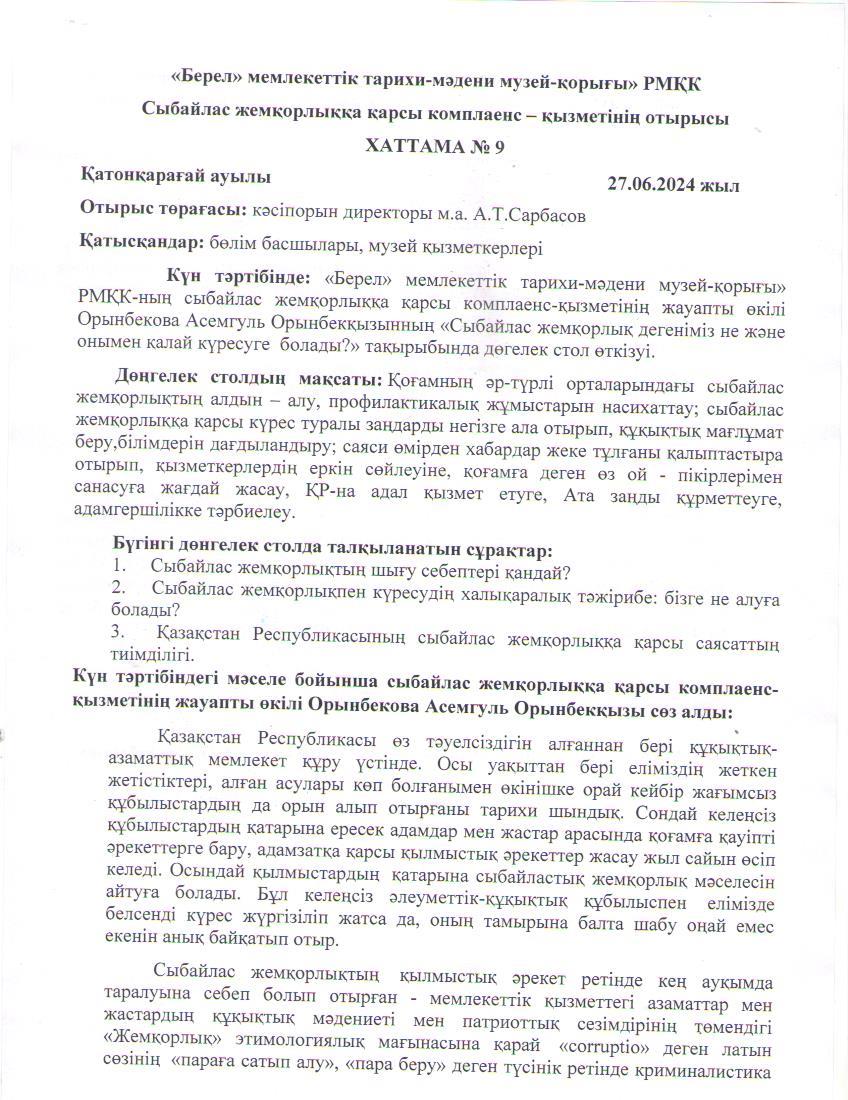 «Берел» мемлекеттік тарихи-мәдени музей-қорығы» РМҚК-ның сыбайлас жемқорлыққа қарсы комплаенс-қызметінің жауапты өкілі Орынбекова Асемгуль Орынбекқызынның «Сыбайлас жемқорлыққа - жол жоқ!» тақырыбында дөгелек үстел өткізді.
