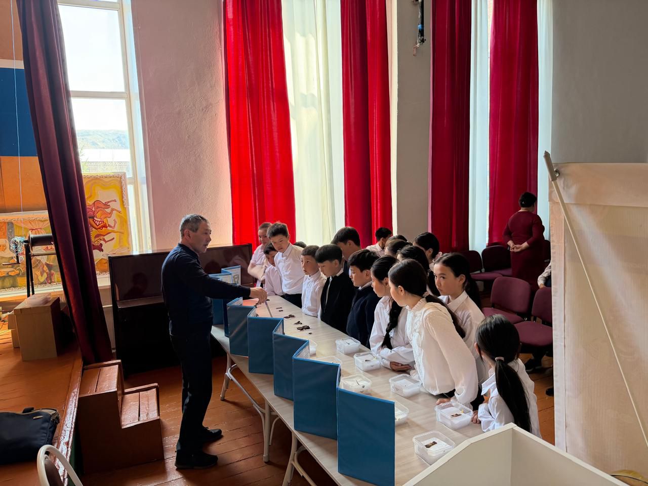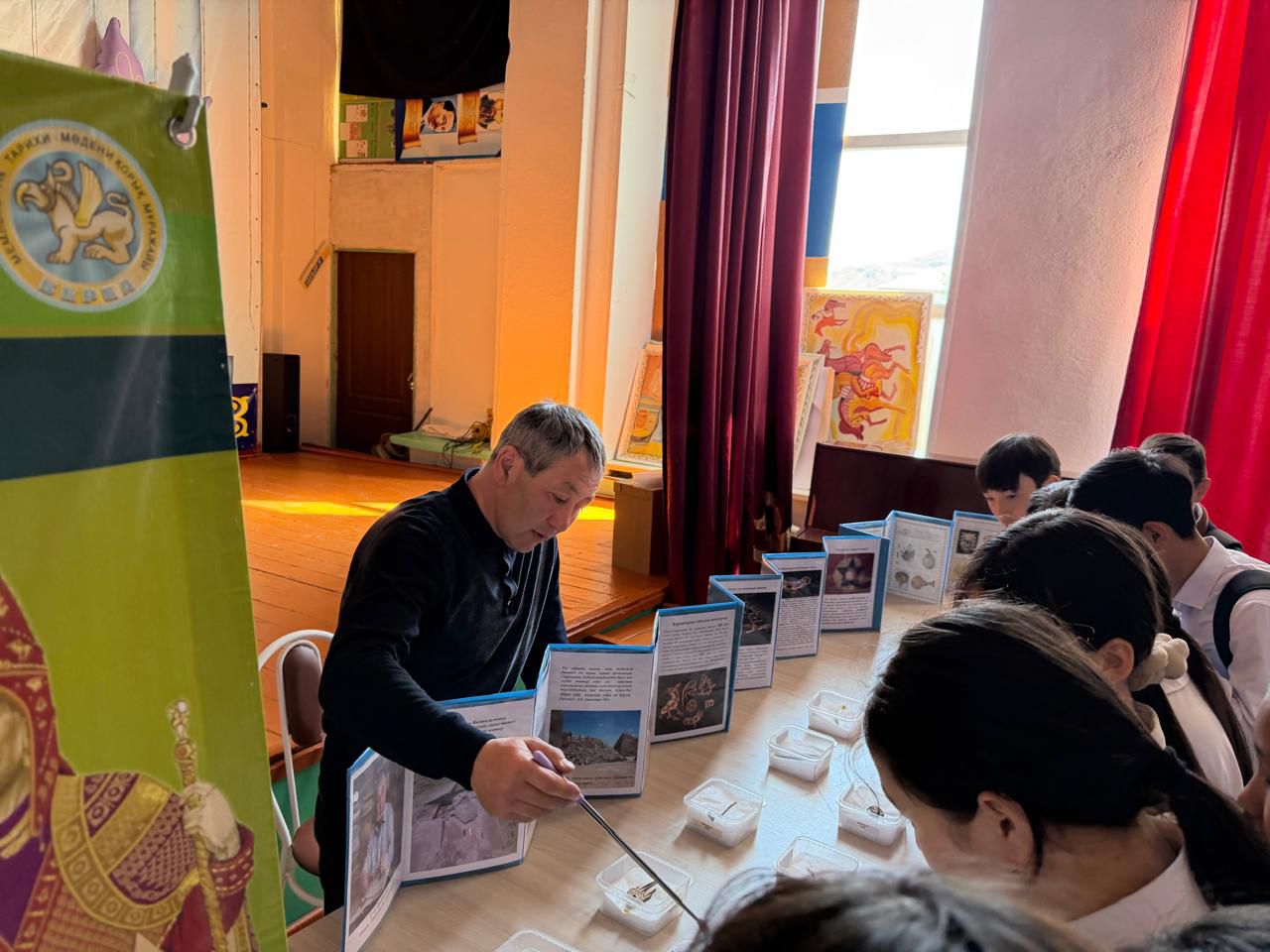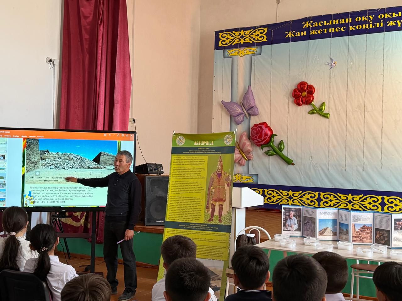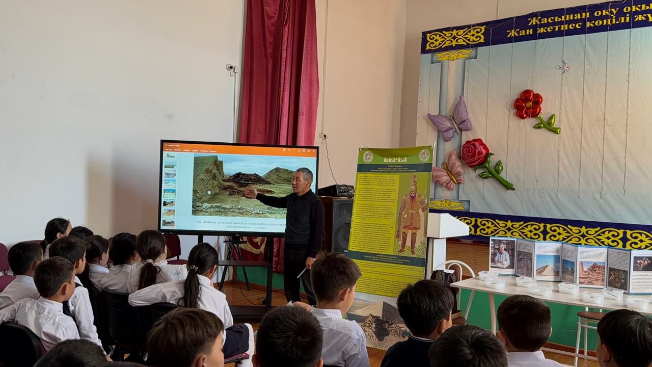 Шілікті қорғандары бойынша экскурсия жетекшісі Зайсан ауданы, Кеңсай ауылындағы орта мектеп оқушыларына Шілікті жазығының «Патшалар мекені» атты көшпелі көрмесін өткізді.